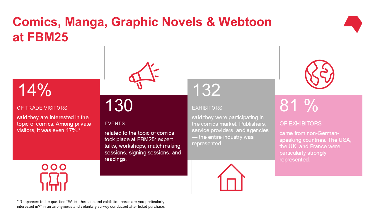 At the Comics Business Centre in Hall 6.1 A62, the focus was on comics professionals and growing the community. In 2025, the Comics Business Centre was expanded to include a webtoon area. The 2025 Guest of Honour, the Philippines, also presented themselves here, as well as the 2026 Guest of Honour, the Czech Republic.